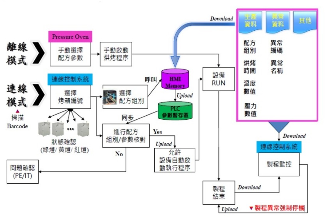 - 自動配方下傳 (Auto Select Recipe):系統依據產品自動選取對應烘烤參數,杜絕人員誤用烘烤作業程式。