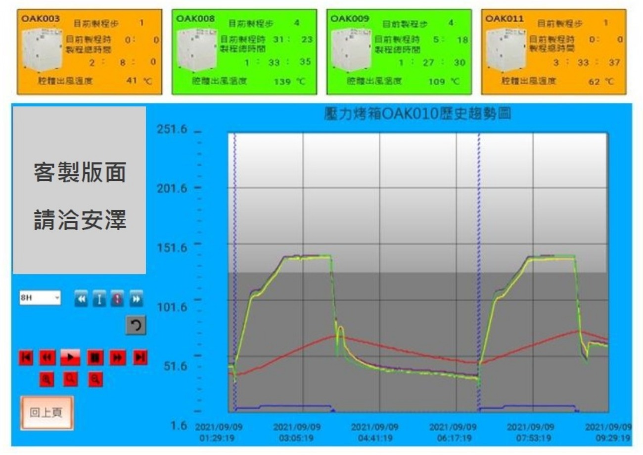 看板下方的歷史趨勢圖能精確抓取壓力烤箱內的各維度數據: